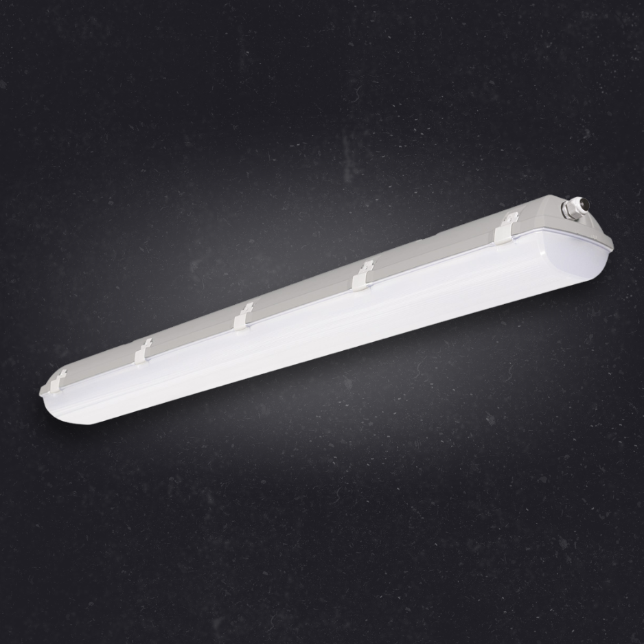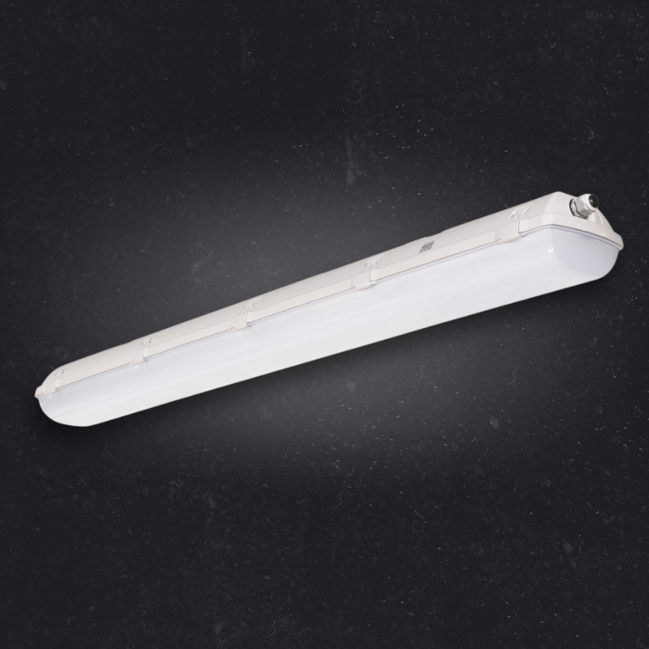 Plastic industrial LED light fitting with high chemical resistance, suitable for outdoor use. Features a translucent acrylate diffuser and IP69…