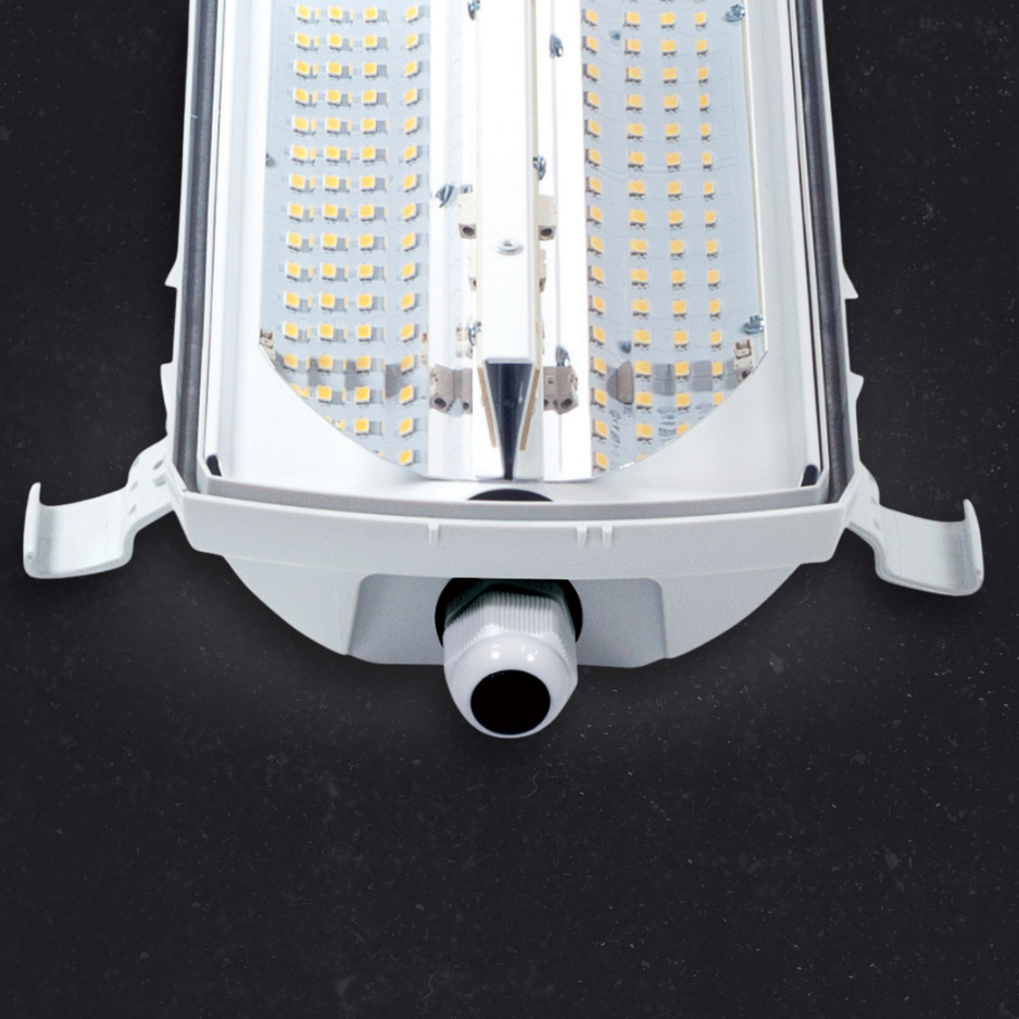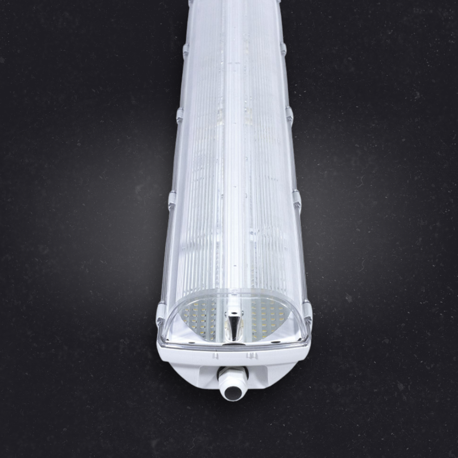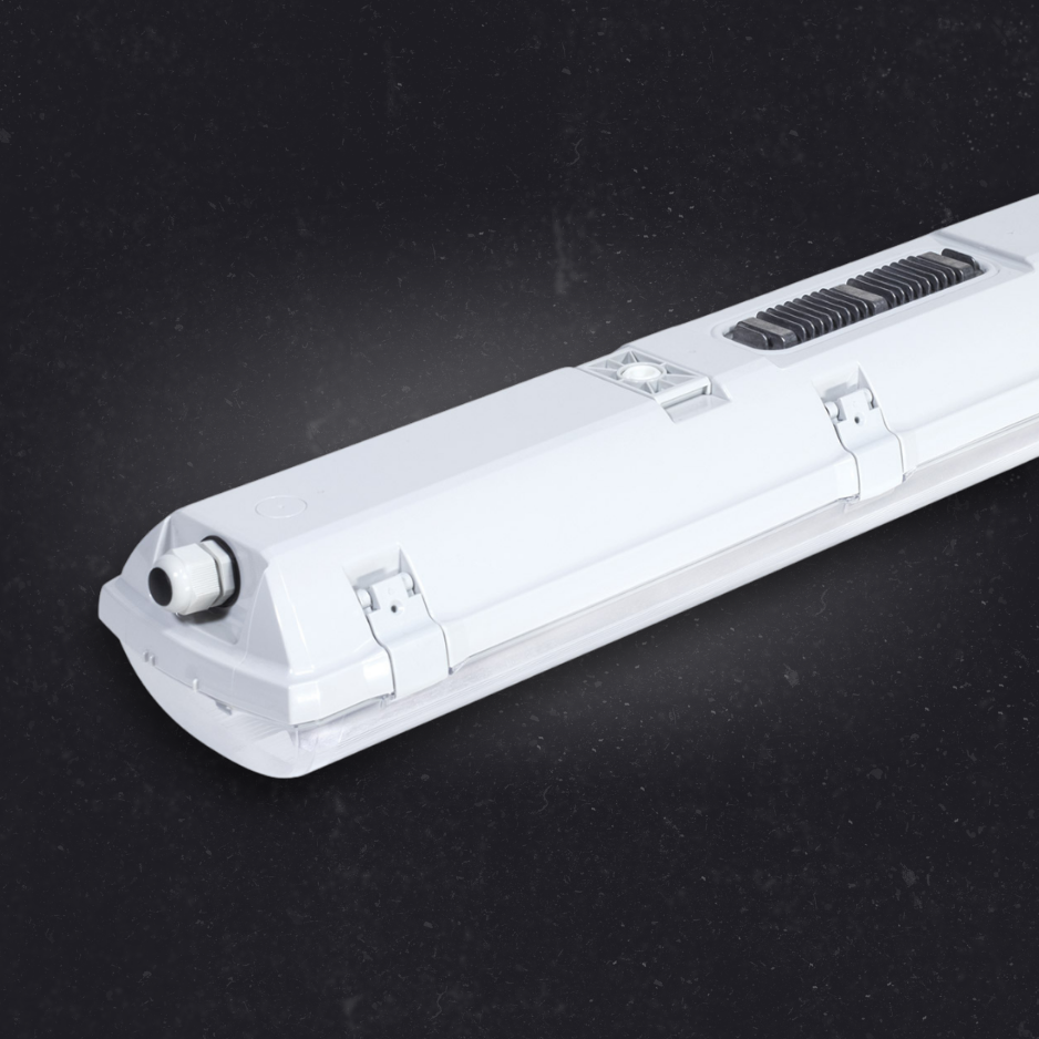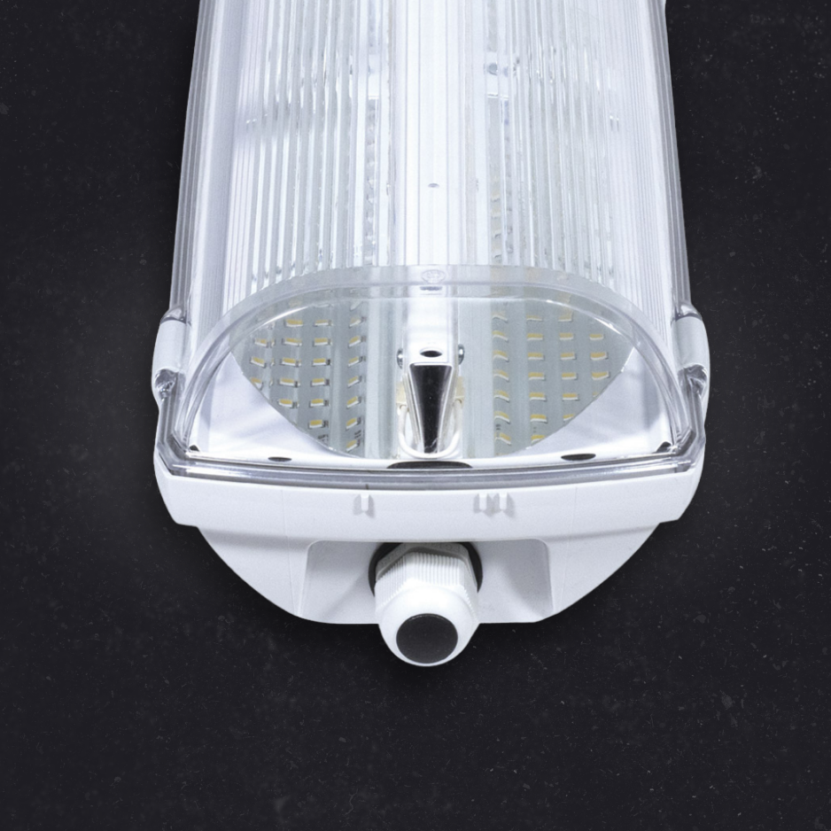 Plastic industrial LED light fitting suitable for rack aisleways with high ceilings, with diffuser made of translucent polycarbonate. The light fitting is resistant to dust, moisture and spouting water. The body and the diffuser made of polycarbonate (PC) have the increased resistance against deformation and impact.