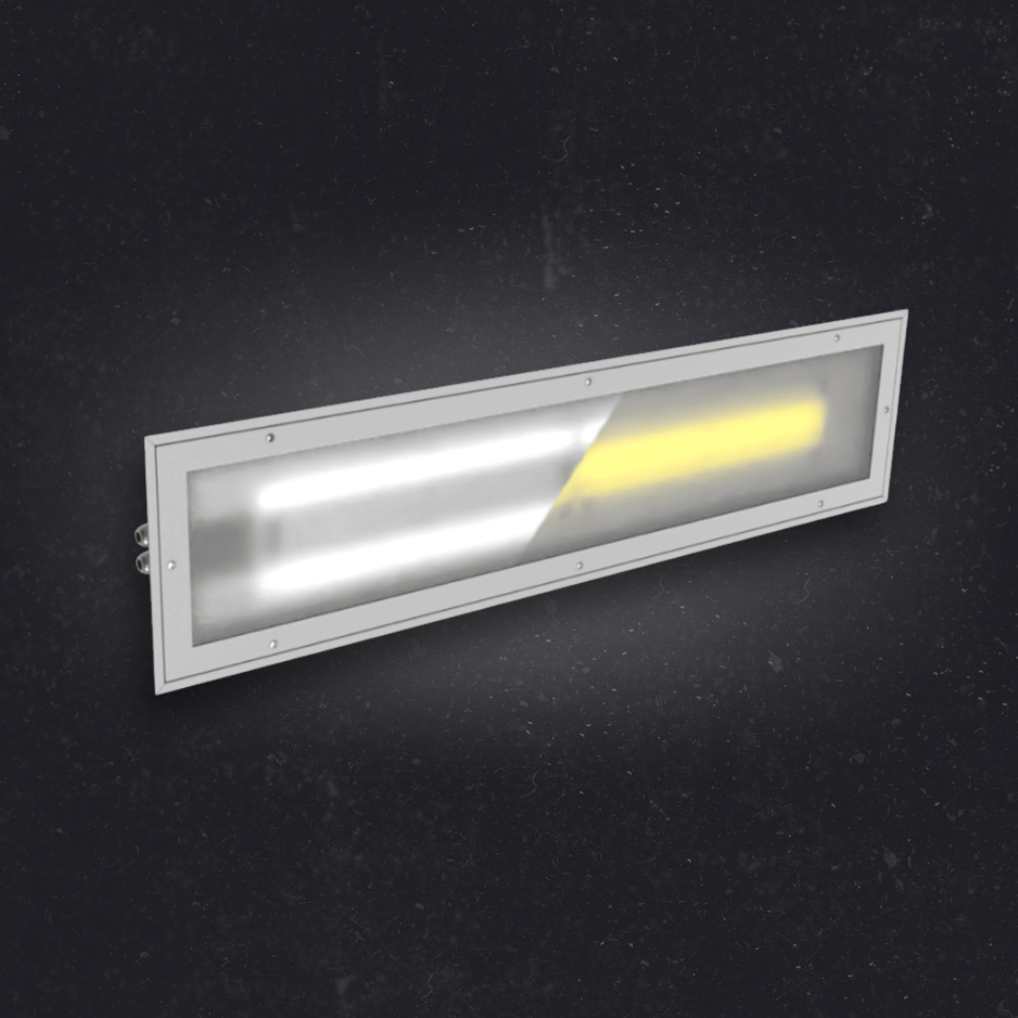 Industrial light fitting with LED modules for suspended coffered ceilings or to be mounted on the ceiling surface. The housing is made of powder coated stainless steel.