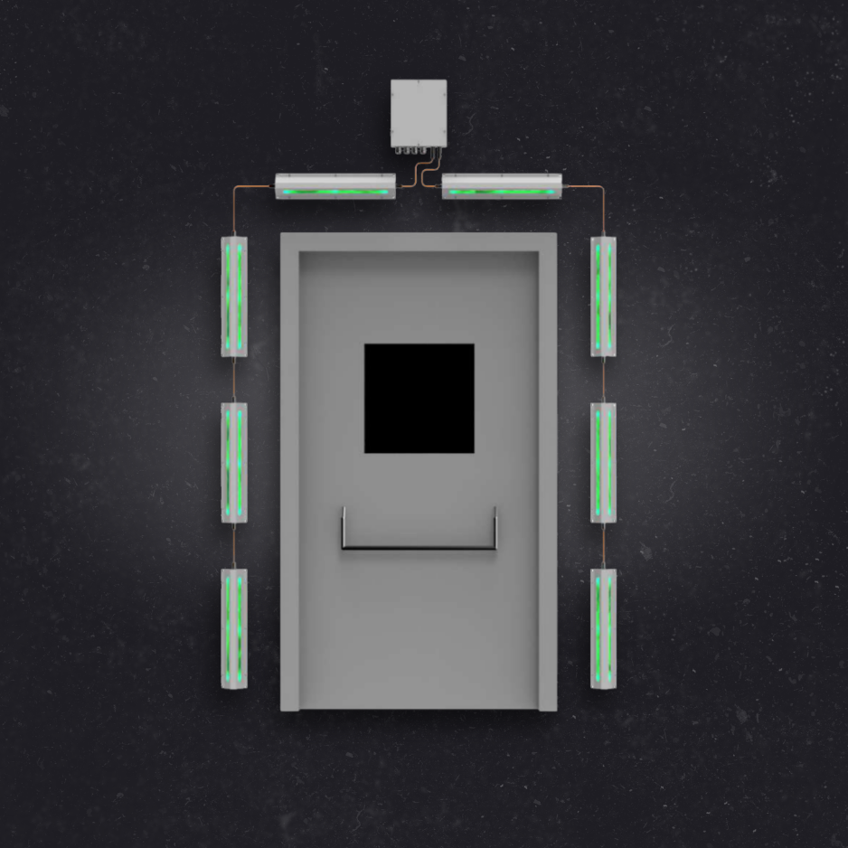 A system of luminaires indicating the emergency exit. The LED luminaires included in this system have been designed to be placed along the outline of the emergency exits. It is possible to adjust the system configuration to the individual needs of the project. The housing is made of stainless steel, while the lampshade is made of tempered glass. The luminaire has CNBOP approval no. 4470/2021.